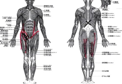 赤い線は硬直やヨジレ。Xは痛みの場所です。