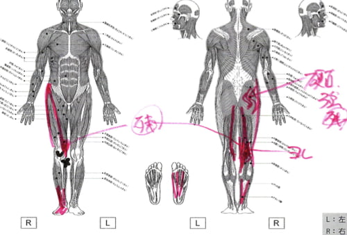 赤い線の部分の筋肉や腱に硬直や捩れがありました。