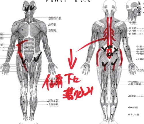 赤い線は筋肉や腱の硬直やヨジレ。