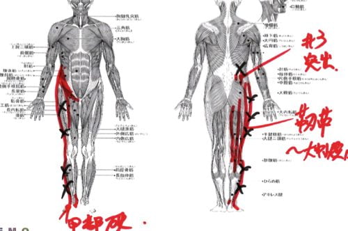 赤い線は筋肉や腱の硬直したりヨジレのある場所